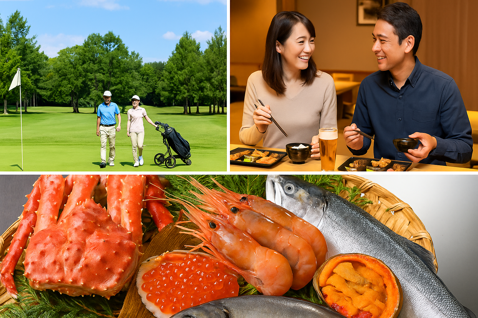 朝は涼しい北海道の名門ゴルフ場で爽快なプレーを満喫し、夜は札幌駅近くの上質なホテルステイで天然温泉や美食を満喫。